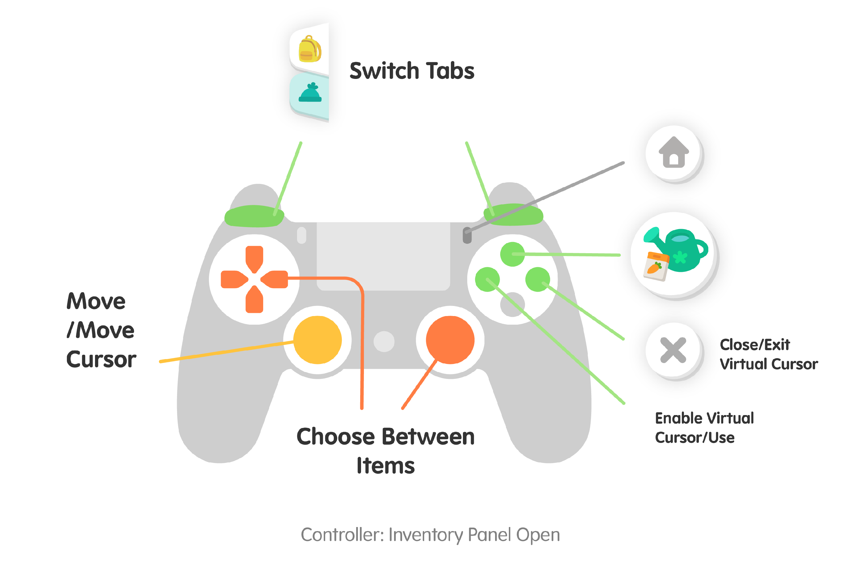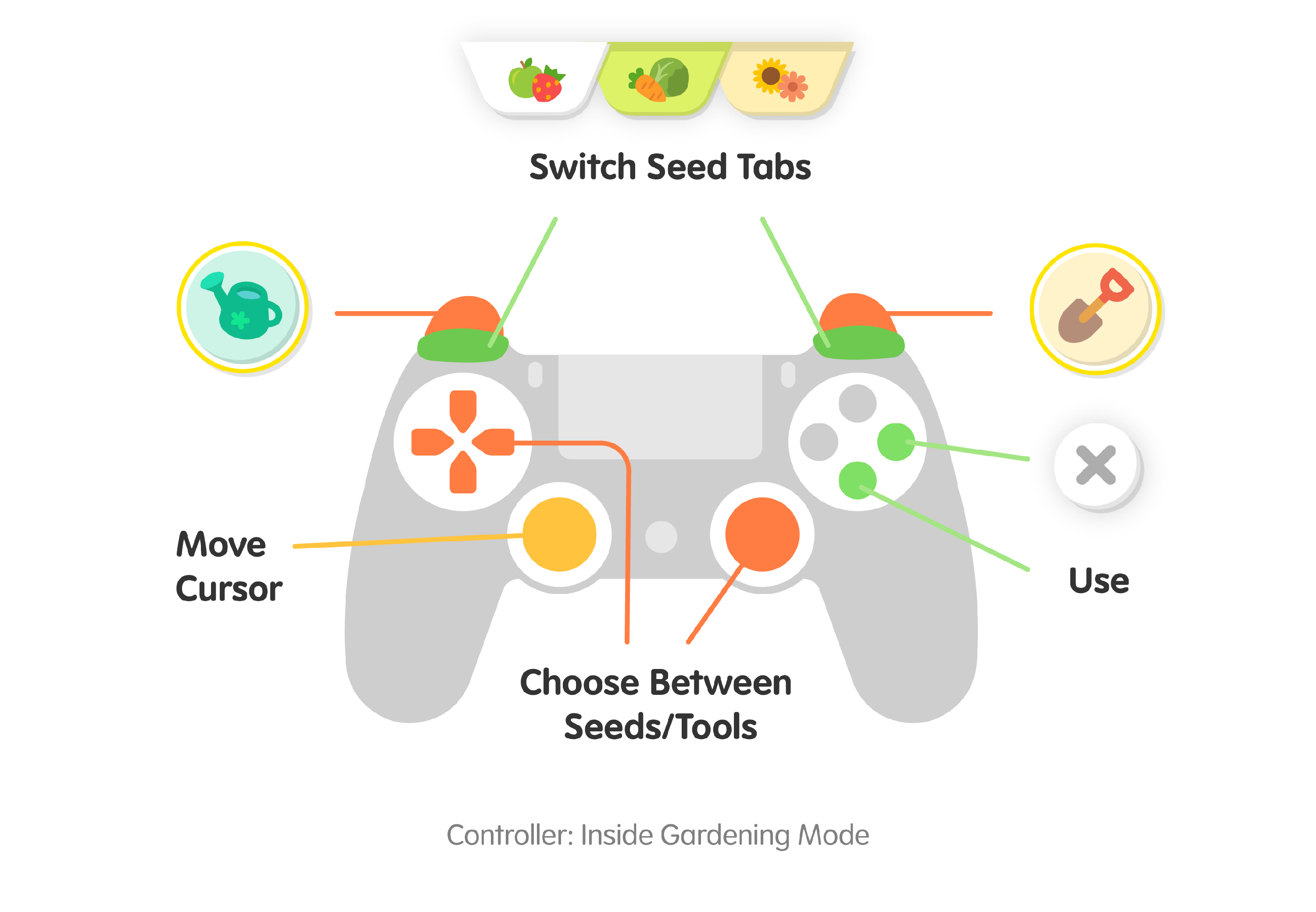 | Right Joystick / D-Pad | Cycle between items (seeds and tools) |